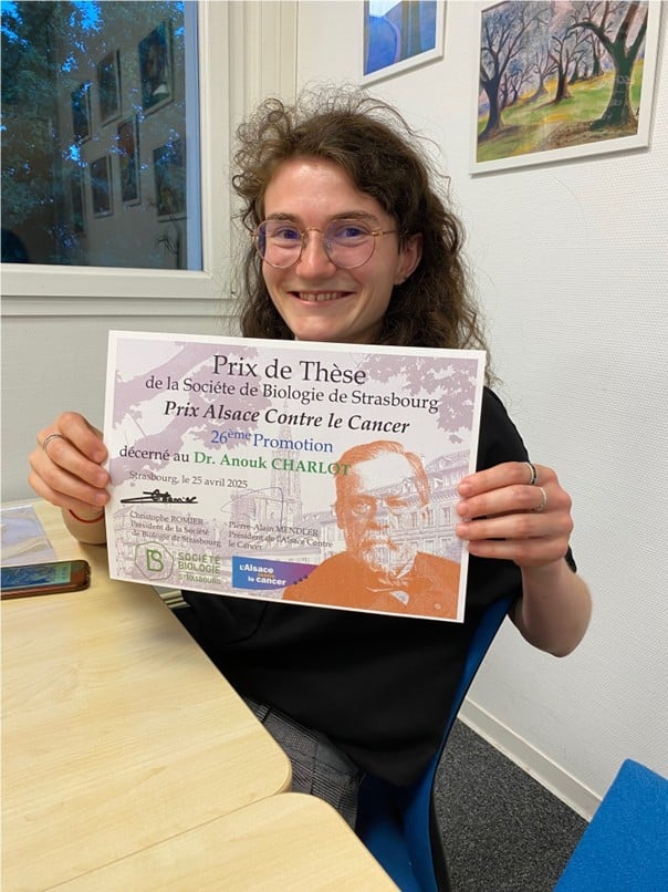 C’est avec plaisir que nous avons reçu le docteur Anouk Charlot de l’UR3072 UNISTRA le 27 juin lauréate du prix de thèse accompagnée du président de la Société de biologie de Strasbourg Christophe Romier pour le prix « Alsace contre le Cancer ».